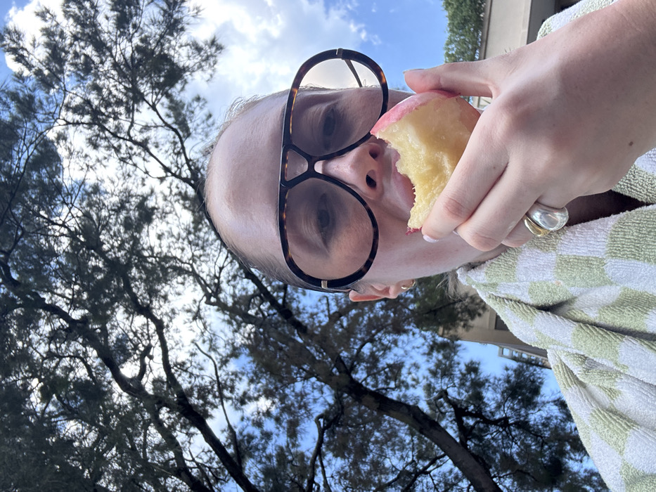 A person wears large aviator glasses and holds an apple with a bite taken out of it near their mouth. The person's hand has two rings. They wear a green and white checkered towel around their shoulder. The background shows trees with blue sky peaking through the branches. The photograph is taken from a low angle, looking up at the subject.