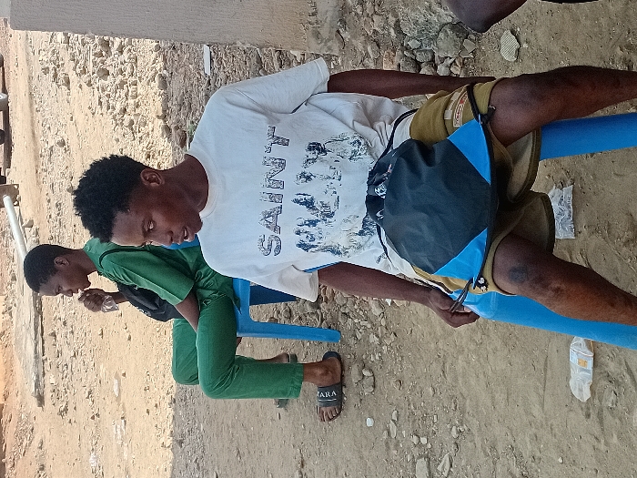 Two young men sit on blue plastic chairs outdoors. One wears a white shirt with "SAINT" printed on it and khaki shorts with a blue and black backpack. The other wears a green shirt and pants and has a black backpack. Both wear sandals. The ground is dirt and gravel. There is debris on the ground. A beam is visible in the background.
