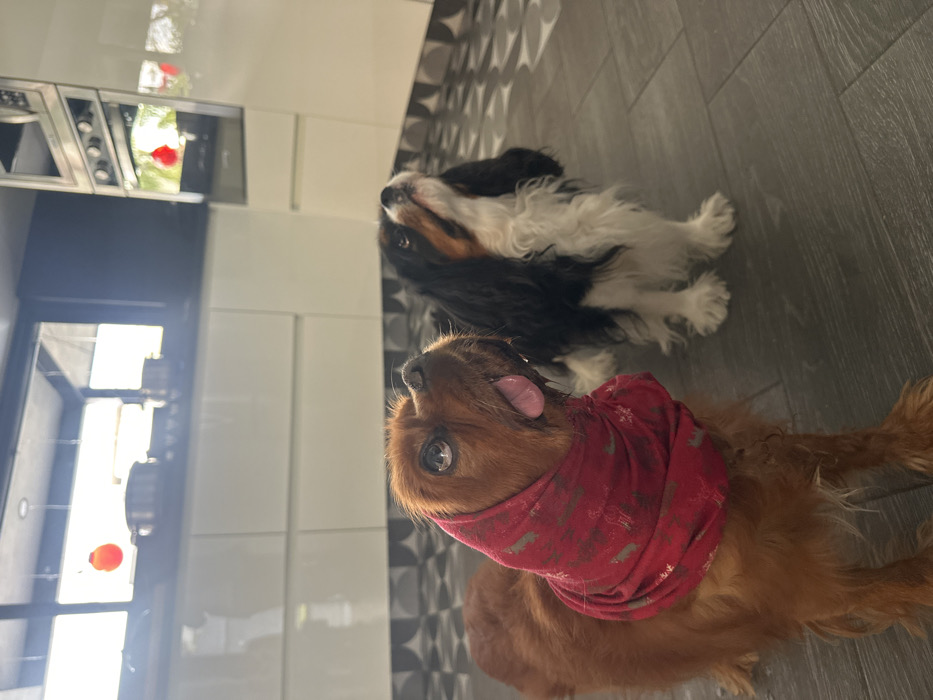 Two Cavalier King Charles Spaniels rest indoors. The foreground dog is a red-toned variant wearing a red patterned covering around its neck and muzzle. The dog's tongue is slightly visible. Behind, the second dog is black, white, and brown. The dogs are in a kitchen with white cabinets and a dark grey floor. Sunlight streams through a window on the left side of the frame.