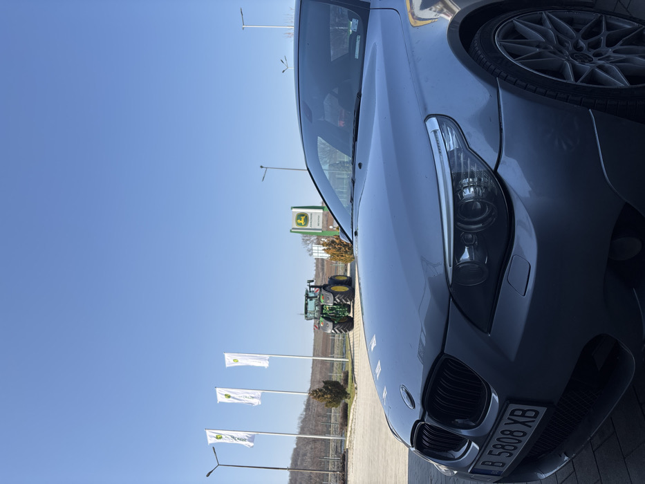 A static, outdoor scene under a clear blue sky depicts a commercial or agricultural dealership in Montana, Bulgaria. In the foreground, occupying the lower half and right side of the frame, is the front-right quarter of a silver-gray BMW E60 5-series sedan. Its front license plate, "B 5808 XB", is affixed to the bumper, and a multi-spoke alloy wheel is visible on the front right. In the midground, a green and yellow John Deere tractor is parked, positioned facing away from the viewer. Behind the tractor and to the left, three white flags bearing the green and yellow John Deere logo fly on poles. To the right of the tractor, a prominent green and yellow John Deere sign displays "JOHN DEERE" above "ЗЕМЕДЕЛСКА ТЕХНИКА" (Agricultural Machinery) and "МОНТАНА". Sparse trees and shrubs are present in the background, with a distant treeline on a gentle hill. No individuals or dynamic actions are present in the scene.