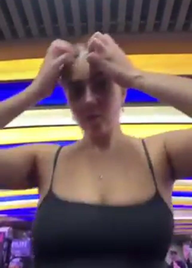 A person with fair skin, light brown hair, and wearing a black tank top faces the camera, securing their hair into a ponytail. They are standing in what appears to be a gym, with exercise equipment visible in the background. The ceiling is covered with horizontal striped lighting. The person talks to the camera.