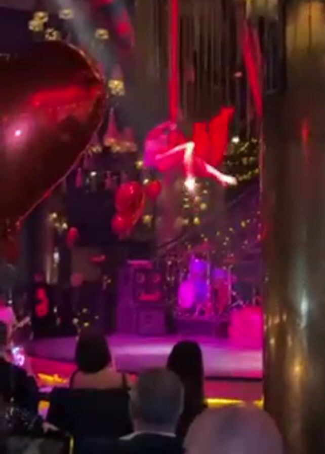 In a dimly lit restaurant or event space, a female aerial performer hangs from red fabric suspended from the ceiling. She is wearing a red dress. The room is decorated with red heart-shaped balloons. Below her, seated patrons watch, some recording on their phones. A band, including drums and amplifiers, is visible on a stage behind the performer. The overall ambiance suggests a festive or romantic event.