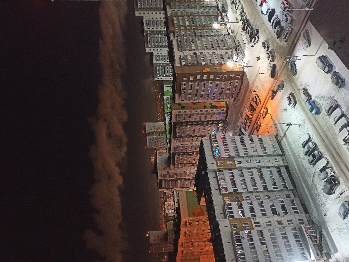 An aerial view at night shows a city by a body of water. High-rise apartment buildings line the shore, illuminated with lights. Parking lots filled with snow-covered vehicles are interspersed among the buildings. Streetlights cast a warm glow on the snowy ground. The water is dark and indistinct, with some diffused lighting near the shoreline.