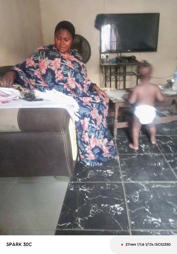The image depicts an indoor residential scene in the city of Unknown, Unknown. An adult female is seated on a dark brown sofa on the left, facing slightly right and downwards. She has dark skin and hair pulled back, wearing a loose dark blue garment with pink and green floral patterns. Her left hand rests on white fabric or clothing draped over the sofa. Behind her, a dark standing or wall-mounted fan is visible. To the right of the fan, a black flat-screen television is mounted on a light-colored wall above a multi-tiered dark metal stand holding various indistinct objects. In the mid-ground, a barefoot infant or toddler with dark skin, wearing only a white diaper, stands facing away from the camera towards a light-colored wooden table. A clear plastic water bottle and other small items are visible on this table. The floor is covered with black tiles featuring white marble-like veining. The walls are plain and light-colored. The child's posture suggests movement. No direct interaction between the individuals is observed.