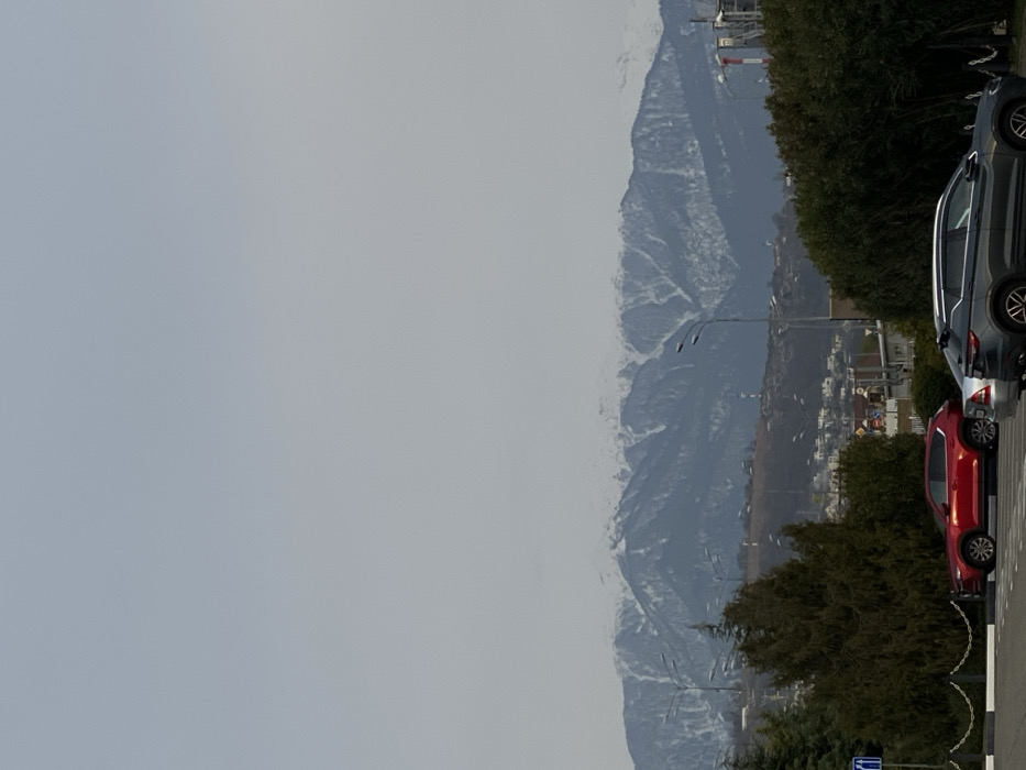 This image depicts a panoramic view in Sochi, Russia, under an overcast sky. In the background, prominent snow-capped mountains of the Caucasus range dominate the horizon, exhibiting dark grey and blue tones with visible white snow covering peaks and slopes. The lower mountain slopes are forested with dark evergreen trees. The midground features an urbanized landscape with rolling hills, scattered low-rise buildings, and dense patches of green trees and shrubs. Several multi-armed streetlights are visible throughout this section, alongside industrial-style structures, including a white and red striped pole on the far right. The foreground presents a paved area, likely a parking lot or a roadside, marked with a white and dark patterned curb or barrier. Two vehicles are visible: a red SUV, possibly a Mazda CX-5, parked facing left, and a dark grey SUV, possibly a Geely Coolray or Atlas Pro, positioned behind and slightly to the right of the red SUV, also facing left. A silver sedan is partially visible between the two SUVs. On the far left, a blue square sign with a white arrow pointing left is partially obscured by foliage. No individuals are visible in the scene. The overall lighting suggests an overcast daytime setting.