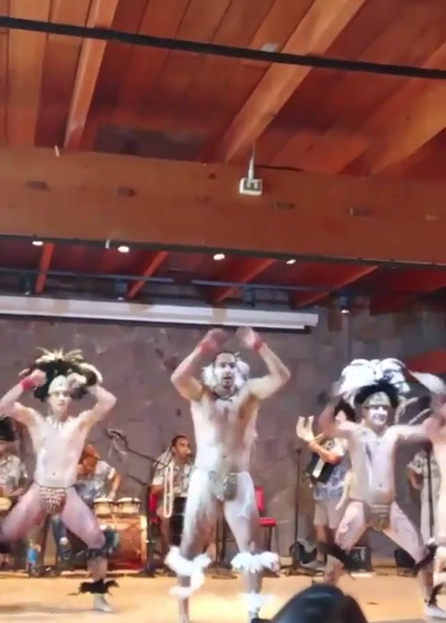 five men performing a Polynesian dance on a wooden stage in an indoor venue. The dancers are shirtless, wearing minimal clothing, and adorned with feather headdresses and leg decorations. Behind them, a band of musicians plays drums and other instruments. The venue has a high wooden ceiling and a stone wall backdrop. An audience, including a woman with dark hair, watches the performance. The dancers move energetically, incorporating stomping, arm movements, and bending into their routine.
