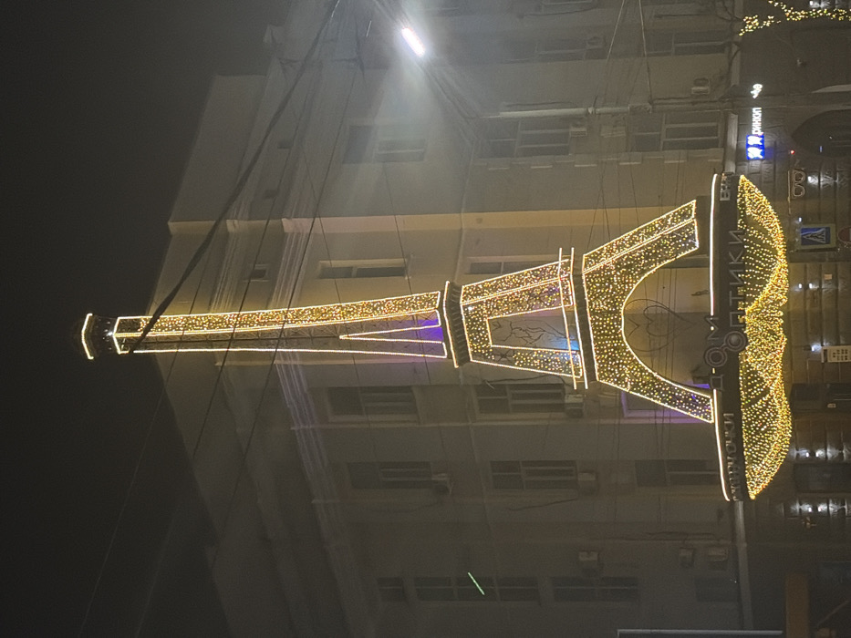 A large, illuminated replica of the Eiffel Tower stands prominently at night in Rostov-on-Don, Russia