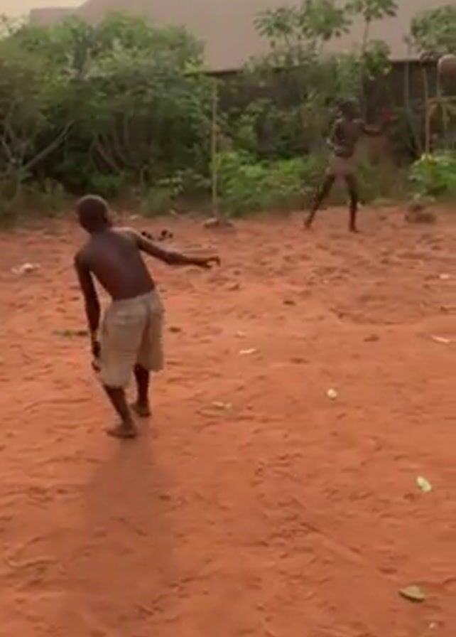 three young, shirtless children playing soccer on a dusty, reddish-brown dirt ground. One child is in the foreground, preparing to kick a small soccer ball, while another stands some distance away, seemingly acting as the goalie, positioned in front of two upright sticks that act as a makeshift goal. The third child is partially visible on the left of the frame. Trees and shrubs are visible in the background along with a building. The scene is set in a natural, outdoor environment. The sky is overcast.
