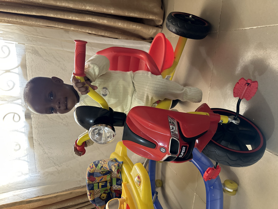 An indoor scene in Barikin Jirga Summa, Nigeria, depicts a young, dark-skinned child seated on a red and yellow three-wheeled tricycle