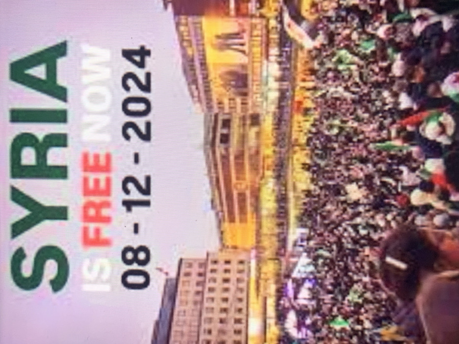 A digital image displays a large, densely packed crowd gathered in Sergels Torg, Stockholm, Sweden, under an overcast sky or during dusk, rather than Al-Mazza Municipality, Syria. The scene is overlaid with prominent green text reading "SYRIA," red text "IS FREE," and white text "NOW," followed by black text "08 - 12 - 2024." The background features multi-story urban buildings characteristic of the square, including the Åhléns City department store on the left and the Kulturhuset with a large illuminated advertisement on the right. Hundreds of individuals in the crowd are seen holding various flags, many of which are green, white, black, and red, consistent with the Syrian opposition flag. The foreground shows the blurred head and shoulder of an unidentified person, facing away from the viewer. No specific actions beyond gathering are discernible among the uniformly dressed crowd.