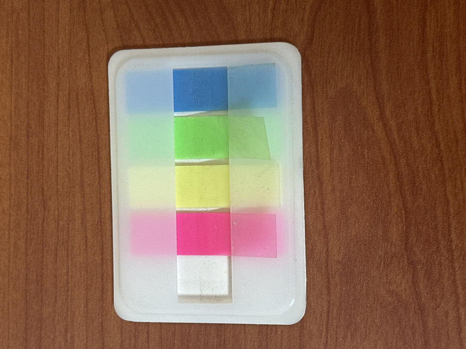 - "A rectangular, translucent white plastic dispenser, approximately 12 cm in length, holds five distinct strips of transparent, self-adhesive page flags" by FM-w9j6l1, licensed under CC BY 4.0