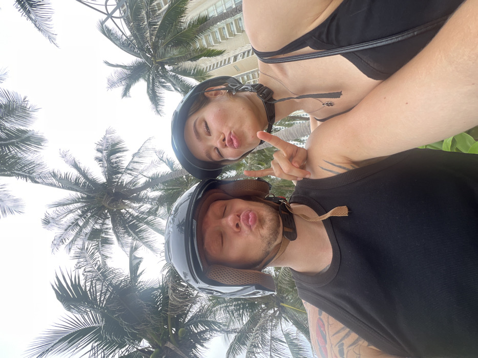 A man and woman wearing helmets are taking a selfie with palm trees in the background. Both are making a kissing face. The woman is wearing a black bikini top, and the man is in a black tank top. Both have tattoos on their arms. The woman is holding up a peace sign. A tall building can be seen in the background behind the trees.