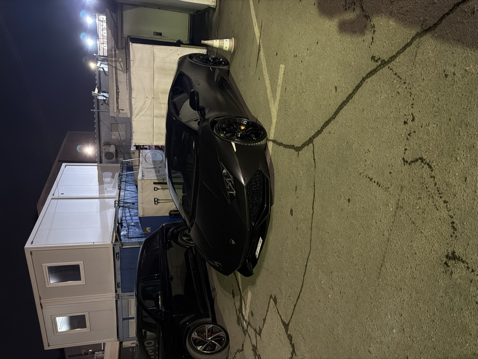 The image captures a nighttime scene within an urban parking or service area, illuminated by artificial overhead lighting. In the foreground, a matte black Lamborghini Huracan is prominently parked at an angle, displaying a Bulgarian "CB" series license plate on its front. The vehicle features black wheels with yellow brake calipers visible. To the left and slightly behind the Lamborghini, a dark-colored SUV, identified as likely an Audi Q7, is also parked, showcasing red brake calipers on its front wheel. The background consists of multiple modular container structures, some stacked, including white units with visible windows and other blue or tarp-covered modules. Industrial elements such as an external air conditioning unit are present. Partial text, "LAUDERS," is legible on a white panel within the background structures. The ground is asphalt, exhibiting numerous cracks and faint white parking lines. A white and orange striped traffic cone is positioned near the front passenger side tire of the Lamborghini. No individuals are visible in the scene. Based on the "CB" license plate prefix, which designates Sofia City, and the visible "LAUDERS" signage, the location is identified as Sofia, Bulgaria, specifically at or immediately adjacent to Lauders Club.