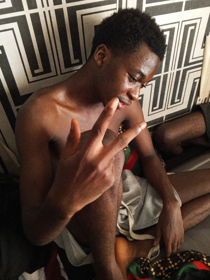 An individual, appearing to be a young adult male, is depicted in an indoor setting. He has short, dark, textured hair and a faint mustache. His dark-toned skin appears moist, consistent with perspiration, particularly on his forehead and shoulders. He is bare-chested. His right hand is raised, with the index and middle fingers extended to form a V-shape gesture, while the ring and little fingers are curled into the palm. He is wearing light-colored shorts with a visible drawstring around his waist. A garment with a black, green, red, and yellow geometric pattern is partially visible below his waist. To the right of the primary subject, a portion of another individual's bare, dark-skinned leg and an article of clothing are visible. The background consists of a wall covered with a black and white geometric patterned material, featuring interlocking rectangular and linear designs. The scene is illuminated, suggesting an indoor environment.