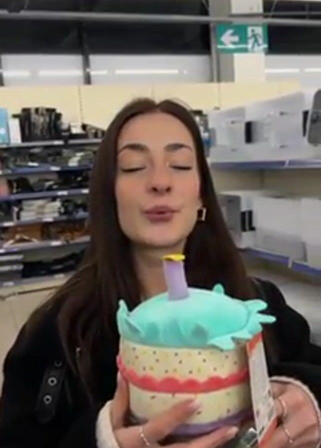 A young woman with long brown hair and multiple rings on her fingers is standing in a store aisle, holding a plush toy that resembles a multi-layered cake with a candle on top