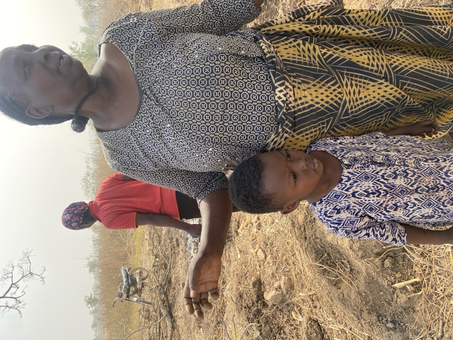An older woman in a patterned dress sits with a young child wearing a patterned blue shirt, in a dry, grassy field. A person in a red shirt and patterned head covering stands further off. A motorcycle lies on its side in the background amidst sparse vegetation. The scene is hazy.