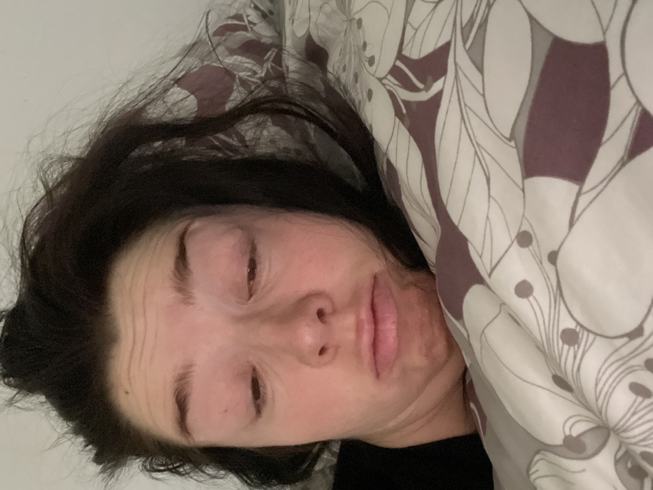 A close-up image depicts an adult female lying down in an indoor setting within the city of Rome, Italy. Her dark, disheveled hair frames a light-skinned face with a tired or drowsy expression. Her eyes are partially closed and directed downwards, exhibiting prominent horizontal wrinkles across her forehead. Her mouth is slightly downturned, forming a subtle pout. The subject's left shoulder and a portion of a dark garment are visible on the lower left. She is resting on a pillow or duvet cover featuring a patterned design of stylized leaves and circular shapes in shades of purple, grey, and white. The background is an indistinct, light-colored surface.