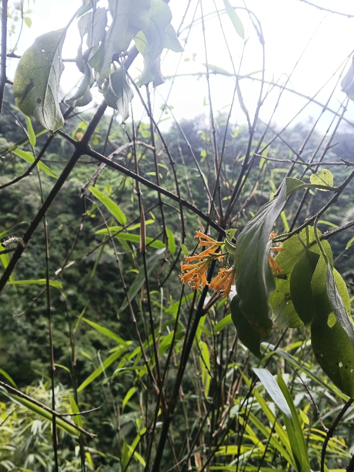 The image displays a detailed view of natural vegetation in Tamghas, Nepal. In the immediate foreground, a cluster of approximately five to seven vibrant orange-yellow tubular flowers is visible on the right, attached to a stem with several green leaves. Surrounding these flowers and extending across the foreground are multiple thin, dark brown to black, largely leafless stalks or branches, interspersed with vibrant green, elongated leaves suggestive of bamboo or tall grasses. The midground is densely populated with similar green foliage. The background reveals a blurred, undulating dark green landscape, consistent with a forested hillside or mountain, receding under a bright, diffused sky. No individuals, animals, or artificial structures are present. The scene is illuminated by natural daylight.