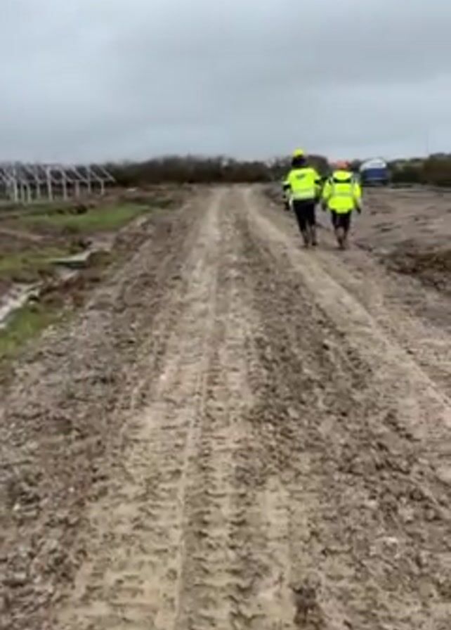 two workers in high-visibility vests and hard hats walking along a muddy path. The path is heavily rutted with tire tracks and surrounded by muddy fields. In the background, there are incomplete metal structures that look like the supports for solar panels. The sky is overcast. The video is taken from the perspective of someone walking on the same path, and briefly shows a close-up of a muddy boot stepping on the path.