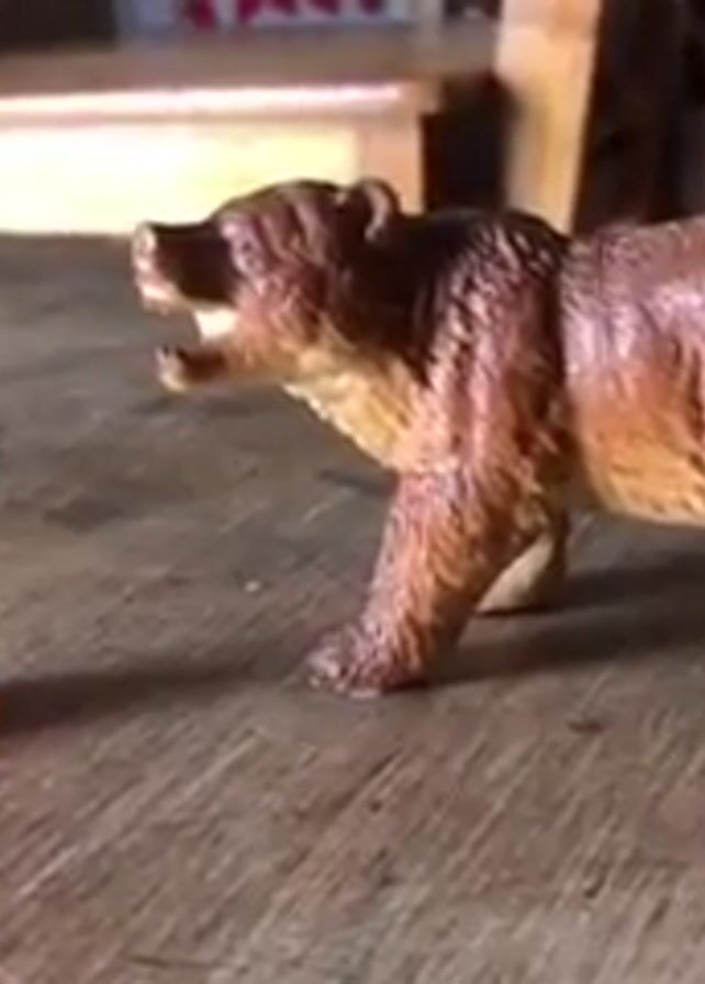 A brown toy bear stands on a wooden table, facing a small, bright orange, plastic dinosaur toy. The bear's mouth is open in a roar. A wooden table and chairs are in the blurred background.
