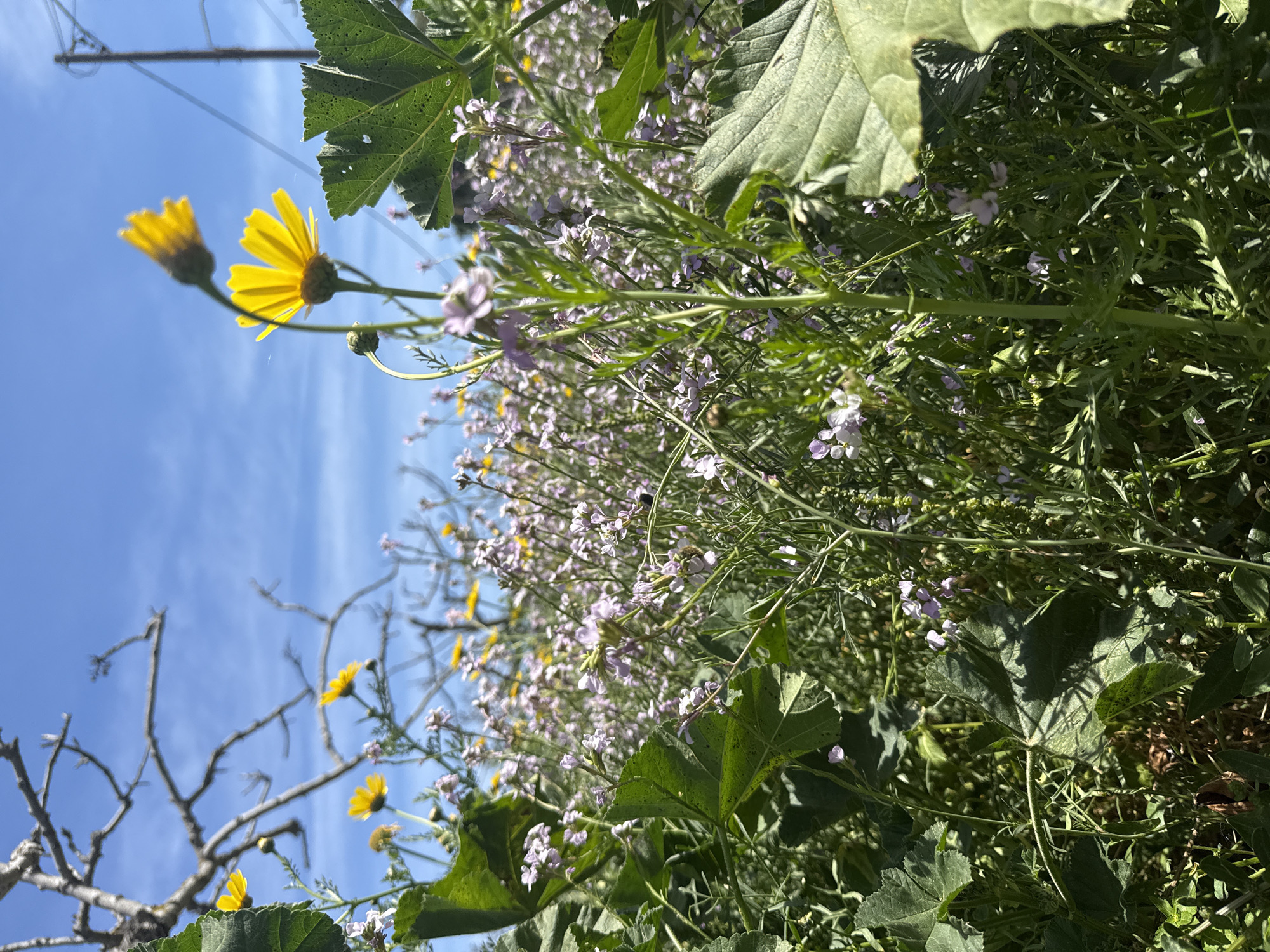 The image depicts a dense field of wildflowers and foliage at ground level in Aegina, Greece, under a clear blue sky. The foreground and midground are dominated by lush green vegetation, featuring broad, palmate green leaves and numerous slender-stemmed plants bearing clusters of small, light purple to pink flowers. Several bright yellow, multi-petaled flowers, some fully bloomed and others in bud, rise above the purple blossoms, particularly on the right side. In the blurred background, bare, gnarled tree branches are visible on the left against the sky, while a dark utility pole with attached overhead wires stands on the right. The scene is brightly illuminated by direct sunlight. No human subjects, animals, or explicit actions are present within the frame.