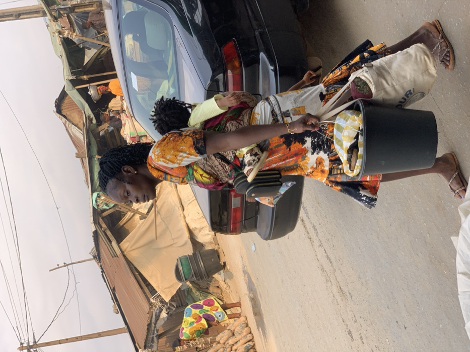 A woman in a patterned dress and sandals carries a bucket and a child on her back. She stands beside a black car on a paved street. Makeshift buildings line one side of the street, while another person in a colorful outfit sits nearby. Overhead, power lines stretch across the sky.