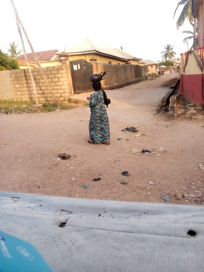 A woman stands on a dirt road, carrying a load on her head, her back facing the viewer. She wears a patterned dress and a dark head covering. Behind her, a brick wall and houses line the road. Some trash is scattered on the ground. Palm trees are visible in the background. The bottom of the image shows a white cloth with some holes. The scene evokes a sense of everyday life in a rural or developing area.