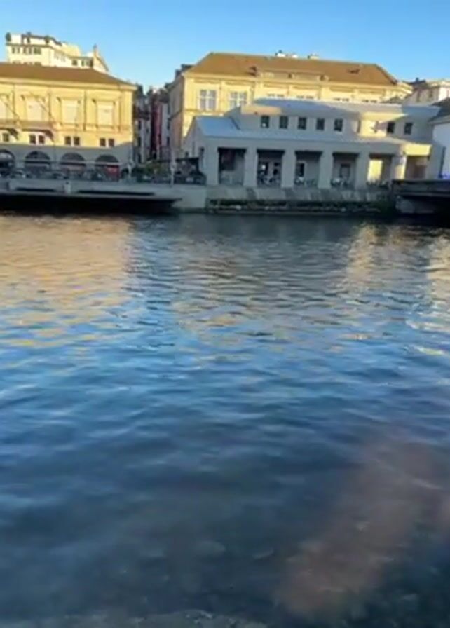view of a river in a city. The water is slightly rippled, reflecting the sunlight. The river is bordered by buildings with a variety of architectural styles, predominantly beige and white, with visible windows and rooftops. The sky is a clear blue. A bridge structure crosses the river, supported by concrete pillars. Distant church towers are visible in the background. The camera pans slowly from left to right.