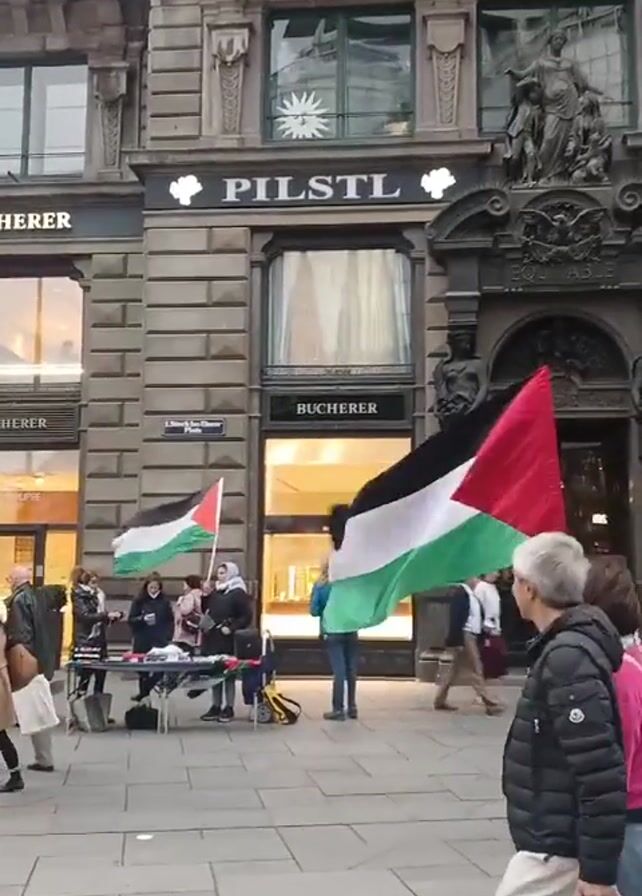 group of people in front of the Bucherer and PILSTL store in Vienna, Austria. Several of them are holding and waving the Palestinian flag. They appear to be at a table with information materials. Other people are walking by on the sidewalk.