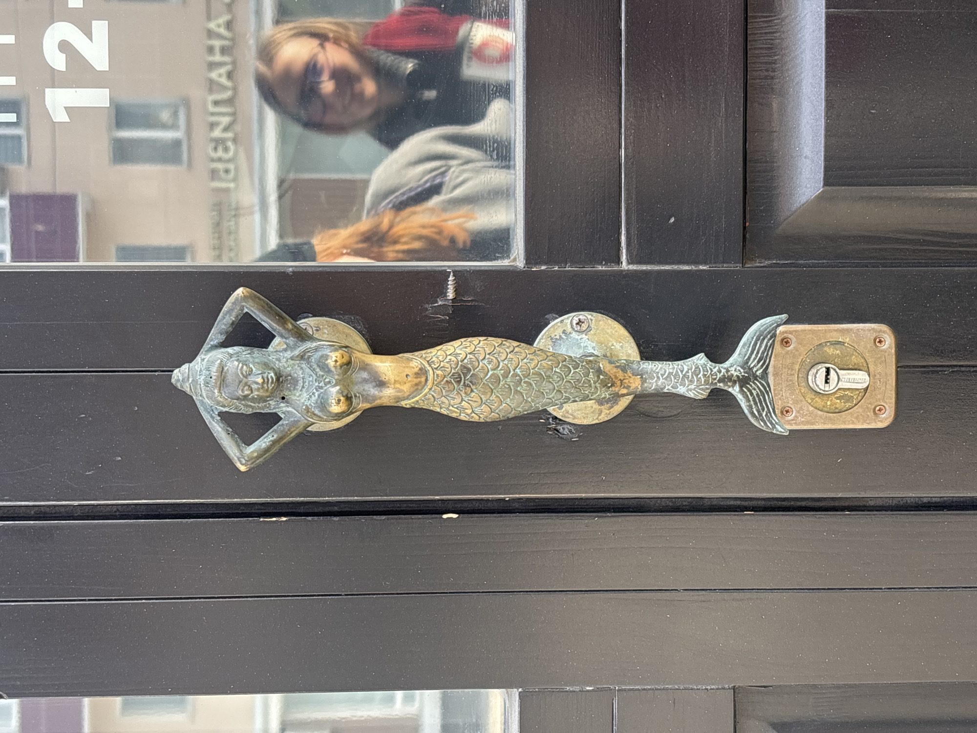 The image depicts a door handle shaped like a mermaid on a black door with a glass window
