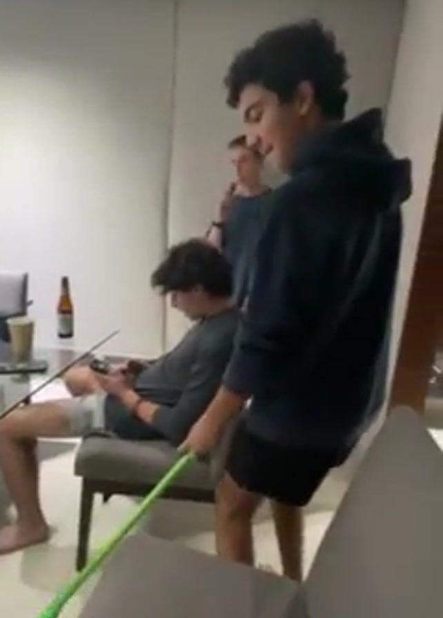 A well-lit indoor room features a few young men. In the foreground, a curly-haired person is leaning into the back of another person seated in a gray chair, holding and using a green mop to playfully push the seated person's chair. The seated person is engrossed in a phone. Another person stands in the background, observing. A glass table is visible to the left with drinks and a decorative bottle on it, and chairs are around the table, with one person visible sitting at the table. The floor is a light tile, and the walls are white.