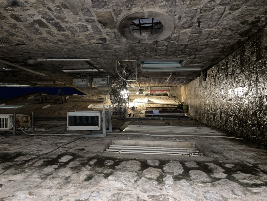 A narrow alleyway with rough stone walls is viewed from the ground looking up. The ceiling is made of stone blocks with a circular opening. The wall on the right is wet. Various pieces of equipment such as air conditioning units, electrical wires, and fluorescent lights are attached to the walls. A bench and some plants are visible further down the alley. The perspective is disorienting, making the scene appear vertically stretched.