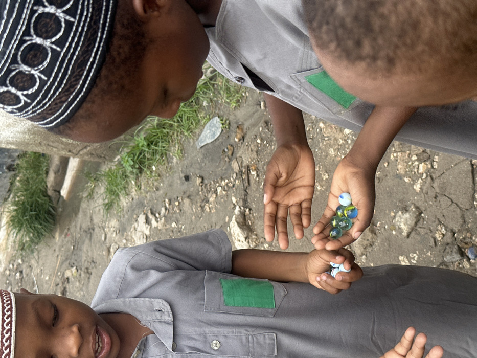 The image displays three young, dark-skinned males interacting on an unpaved street or alleyway in Dar es-Salaam, Tanzania. In the foreground, a boy on the left, wearing a grey long-sleeved tunic with a rectangular green patch on the left chest pocket and a light-colored kufi with a brown embroidered pattern, holds approximately three to four light-colored marbles in his cupped left hand. His head is slightly tilted, and his gaze is directed towards the hands of a second boy. This second boy, positioned to the right and facing the first, wears a similar grey long-sleeved tunic with a green patch and a black kufi with white and brown embroidered patterns. He holds approximately six to seven colorful glass marbles (including blue, green, yellow, and white) in his cupped hands, presenting them to the first boy. Both boys are focused intently on the marbles. The top of a third child's head is visible in the bottom right corner of the frame. The ground is an uneven, rocky dirt path with scattered debris, including a shard of glass or plastic, and patches of green weeds. In the background, a shallow water channel or ditch is visible, bordered by green vegetation and a light-colored concrete structure.
