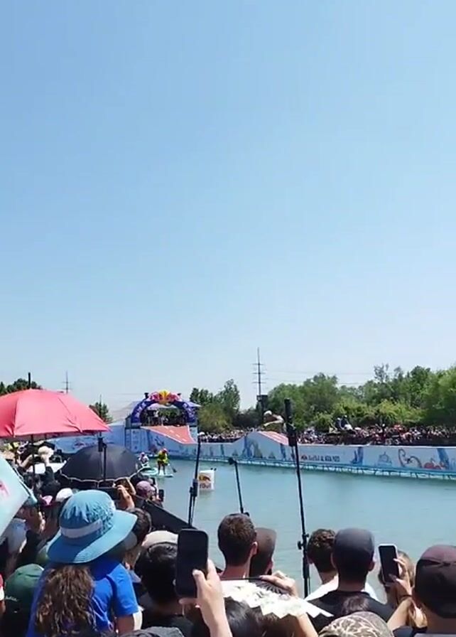 - "A person jumps a ramp on a wheeled vehicle into a body of water in front of a crowd of people who are recording with their phones" by FM-ZqBmD2, licensed under CC BY 4.0