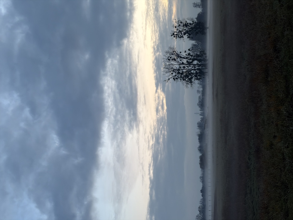 A landscape image shows a field on a foggy day, dominated by muted tones. Dark clouds fill the left side of the frame, contrasting with the brightening sky toward the center. Bare trees are visible in the middle ground, some adorned with mistletoe, partially obscured by fog. A wire fence runs along the horizon, delineating the field from the tree line. The right side of the image shows a dark expanse of land, adding to the somber atmosphere.