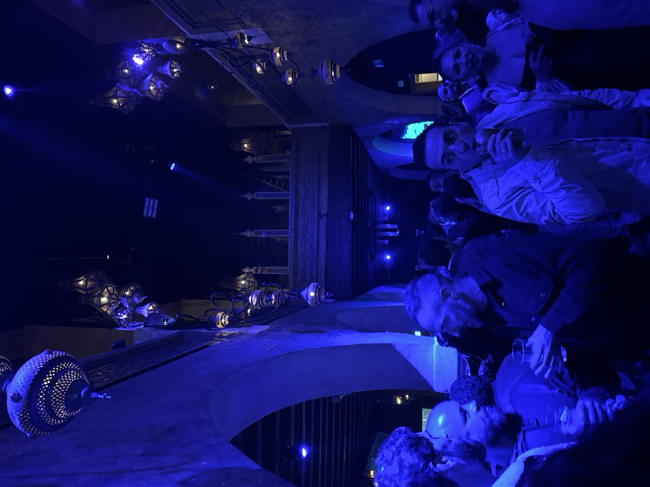 The scene depicts an indoor social gathering or event in Jerez, Spain, characterized by Moorish or Andalusian architectural elements. The environment features textured walls and multiple arched passageways, some serving as entrances or architectural features. Overhead and along the walls, numerous ornate, possibly metal-punched or glass-inset, lanterns hang at varying heights. A second-story balcony with a detailed balustrade is visible in the mid-ground, extending across the width of the space. The overall lighting is a deep, pervasive blue ambient light, creating strong shadows and highlights. Overhead spotlights are visible, casting blue beams into the dark ceiling space. Approximately 20-30 adults are present, occupying the lower level of the venue. In the foreground left, a group of three men is visible: a man with a beard on the far left, a bald man with a beard looking right, and another bearded man holding a clear plastic cup containing a beverage. In the foreground center-right, a man wearing a light-colored jacket holds a glass to his mouth, actively drinking, with a wide-eyed expression. To his immediate right, a woman in a dark dress is visible, looking slightly right with a faint smile. Other individuals are scattered throughout the mid-ground and background, generally out of focus, standing and engaging in conversation. People are holding various drinking vessels. The overall atmosphere suggests a lively, crowded social event.