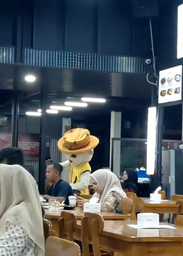 The video captures a brightly lit interior space, possibly a restaurant, with wooden tables and chairs arranged throughout. Several people are seated at the tables, engaged in various activities. One woman is looking at her phone. The person wearing a tan hijab is also looking at their phone. One of the people seated at a table has short, dark hair and is wearing a black shirt. A woman wearing a hijab is seated behind the other person wearing the hijab. A notable element is a figure dressed in a costume, potentially a mascot, with a large tan hat, a yellow vest and a white face. The figure is standing near one of the tables, seemingly interacting with the occupants. The background features dark walls, light fixtures, and what appears to be a menu board. Overall, the scene suggests a casual dining environment with the presence of a costumed character adding an element of novelty.