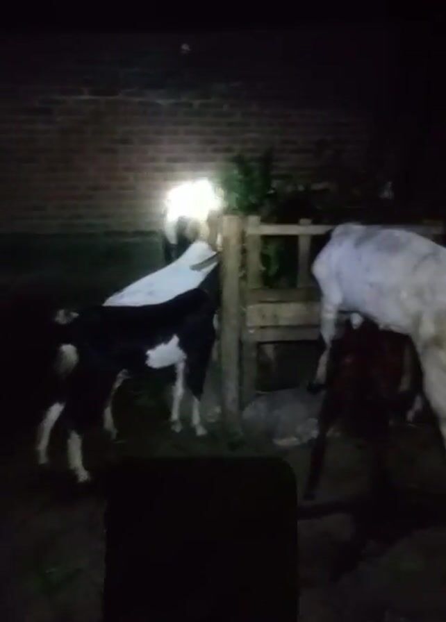 At night, several goats are gathered under a light source. One black and white goat stands near a wooden structure, while another goat, mostly white, is being suckled by a smaller brown goat. Another white goat stands beside them. The background includes a brick wall. The scene is poorly lit and the camera moves slightly, creating some blur.