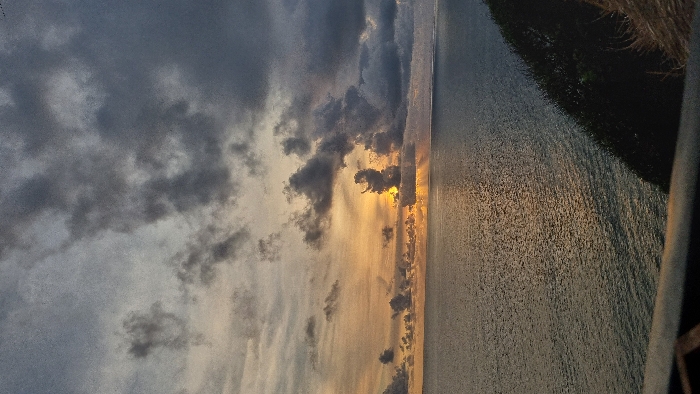 This image presents a panoramic view of the Indian Ocean and sky from an elevated coastal perspective in Uluwatu, Indonesia. The scene is captured during sunset or sunrise conditions, with the sun positioned low on the horizon, emitting a bright yellow-orange glow. A dense, dark grey cloud formation partially obscures the sun, from behind which distinct crepuscular rays project downwards onto the ocean surface. The sky above is largely covered by a mixture of dark grey and lighter grey clouds, ranging from thick, heavy masses near the horizon to more dispersed formations higher up. The ocean surface exhibits ripples and reflects the ambient light, displaying a shimmering path of sunlight extending from the horizon towards the foreground. On the lower right, a steep, dark, and densely vegetated cliff edge is visible, descending towards the water. A dark, horizontal railing or structural element occupies the extreme bottom edge of the frame, indicating an elevated viewing platform. No human subjects or explicit actions are present within the frame.