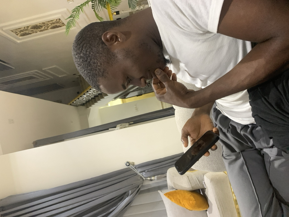 An African man sits on a sofa, wearing a white T-shirt and gray sweatpants. He holds a dark-colored phone in his right hand. His left hand is touching his face near his beard. A gray curtain hangs in the background. A decorative plant sits atop a surface out of focus. The room is brightly lit with white walls and a modern interior design, including decorative ceiling details.