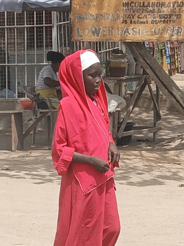 - "An outdoor scene in Hotoro South, Nigeria, depicts a dark-skinned individual, presumably female, standing in the foreground, facing right (viewer's left) with a slight open-mouthed expression" by FM-TPw5z1, licensed under CC BY 4.0