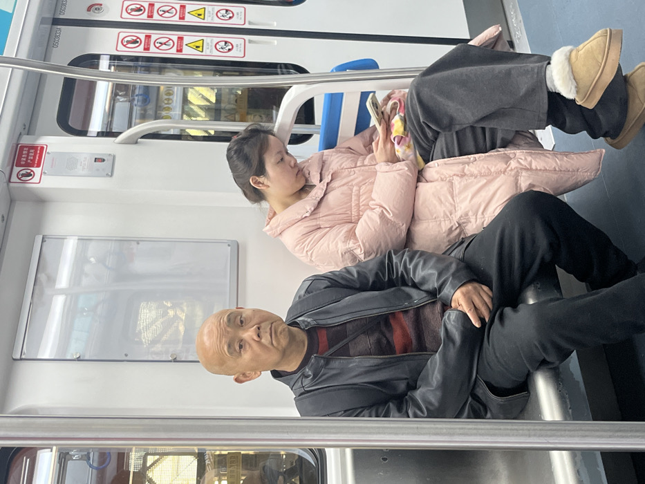 An Asian man and woman occupy seats on public transit. The man, with a bald head, wears a black leather jacket over a striped shirt and black pants. The woman, sitting behind him, is in a pink puffer jacket, gray pants, and light brown Ugg boots. She's looking at her phone. They are both sitting, leaning, and stretching out on the seats, taking up extra space.