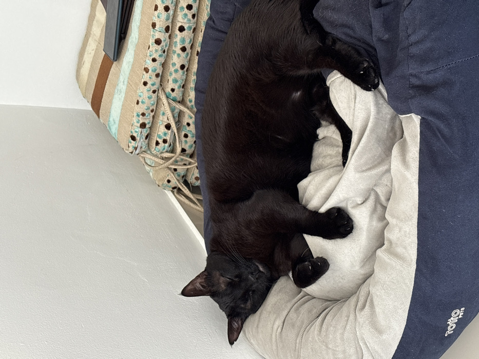 - "A black cat is depicted sleeping on its left side within a two-tone pet bed" by FM-hKfOI2, licensed under CC BY 4.0