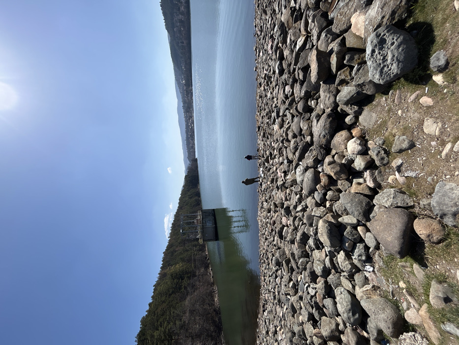 A wide-angle view depicts a large reservoir or lake located near German, Bulgaria, under a clear, bright blue sky with a prominent sun glare in the upper right. The immediate foreground consists of a steeply sloped embankment densely covered with irregular, various-sized grey and brown boulders and rocks, interspersed with sparse patches of dry grass and dirt. In the midground, two individuals stand at the water's edge, facing away from the camera and towards the lake. The person on the left is taller, wearing dark clothing, and stands slightly behind a shorter individual on the right, also in dark attire. Both appear to be observing the water. A concrete structure, resembling a water intake tower with visible piping and machinery, rises from the darker green water near the left bank. This bank is densely forested with coniferous trees. The main body of the lake extends across the midground and background, appearing calm with a blue-green hue, reflecting the sky and sunlight. In the background, a town or settlement comprising numerous buildings is visible along the far shoreline and on the lower slopes of distant, partially forested hills. The sky above is uniformly clear and blue.