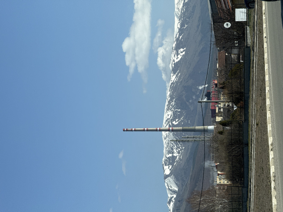 The image depicts an outdoor scene in Zlatitsa, Bulgaria, viewed from ground level on a clear day. In the background, a range of large, snow-capped mountains stretches horizontally across the frame, with patches of snow contrasting against the darker, exposed rock and vegetation. Above the mountains, the sky is bright blue with scattered, patchy white cumulus clouds. Dominating the mid-ground, slightly left of center, is a tall, slender industrial chimney, painted with alternating horizontal bands of light grey and red-orange. To the right of the large chimney, a complex of industrial buildings with red roofs and various structures emits plumes of white smoke or steam into the air. Further left and integrated with the industrial structures, several multi-story residential buildings with light-colored facades are visible. A tall, latticed metal tower stands near the main chimney. In the foreground, a paved road with a light-colored curb and a strip of barren dirt/grassland runs horizontally. A dark metal fence separates the foreground from the mid-ground structures. On the far right, a portion of a dark-colored vehicle is visible on the roadside, adjacent to a white circular traffic sign displaying a black truck symbol, indicating a restriction. Barren trees and shrubs are scattered throughout the mid-ground. No individuals are discernible.
