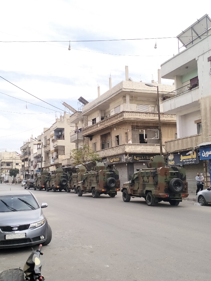 The image captures a street scene in Homs, Syria, under an overcast sky. A convoy of at least seven olive green and camouflage-patterned armored vehicles, consistent with light armored personnel carriers or armored patrol vehicles, proceeds in a single file down the asphalt road, moving away from the viewer. Each vehicle features a rear-mounted spare tire and appears to have a turret or weapon mount on its roof. In the immediate foreground on the left, a silver Kia Forte sedan (Syrian license plate ٦٧٠١٦٩ Homs) is parked, facing the viewer, with its front passenger tire visibly deflated. The partial front of a dark scooter or motorcycle is visible at the bottom left edge of the frame. Civilian cars are also visible parked further down the street and partially on the right. The street is flanked by multi-story buildings, appearing to be a mix of residential and commercial structures. Many buildings exhibit signs of wear, exposed rebar on rooftops, and some appear to have unfinished construction elements or damage. Several rooftops are equipped with solar panels. Ground-level storefronts display signage with Arabic script; one partially legible sign on the right includes "BANU" and "وحدة الحوية" (Wihdat al-Hawiyyah). Two individuals are visible on the right sidewalk, standing near a parked civilian vehicle and observing the street. Additional indistinct figures are present further down the street on the left. Overhead utility wires are visible against the sky.