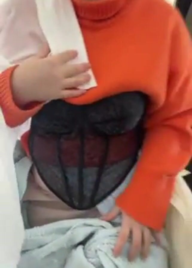 A woman stands indoors in front of a wooden door, a painting on an easel, and an off-white wall. She wears an orange turtleneck sweater, a black corset, and is draped with white, blue, and tan fabrics. The fabrics are wrapped and knotted around her lower body. She looks directly at the camera.