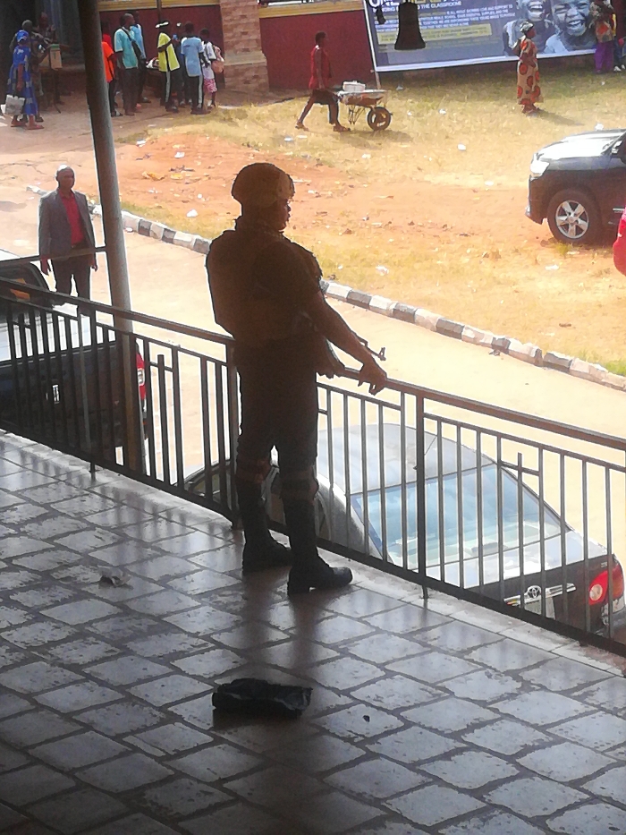 The scene depicts a street-level view in Alor, Nigeria. In the immediate foreground, a tiled floor with a rectangular pattern is visible, upon which a dark, irregular object rests. A dark metal railing runs horizontally across the mid-ground. Standing behind this railing, with their back to the viewer, is an individual wearing a dark uniform, helmet, and boots, holding a long firearm (appearing to be a rifle) with both hands, resting it on the railing. Beyond the railing, a dirt ground area is visible, containing sparse vegetation and scattered debris. A paved curb delineates this dirt area from a narrow paved section where a dark-colored sedan (possibly a Toyota) is partially parked below the railing. Further right on the dirt, a dark SUV is parked, with the rear of a red vehicle partially visible behind it. Multiple individuals are present in the background. To the left, a group of people in casual attire stand. Further right, a man in a red shirt pushes a yellow wheelbarrow containing items. To the far right, a woman in a patterned dress stands near a large billboard featuring images of smiling people and text. A reddish-brown building facade is also visible in the background. To the far left, behind the railing and near a dark parked vehicle, a man in a grey jacket and red shirt stands. The scene is illuminated by natural daylight, casting shadows.