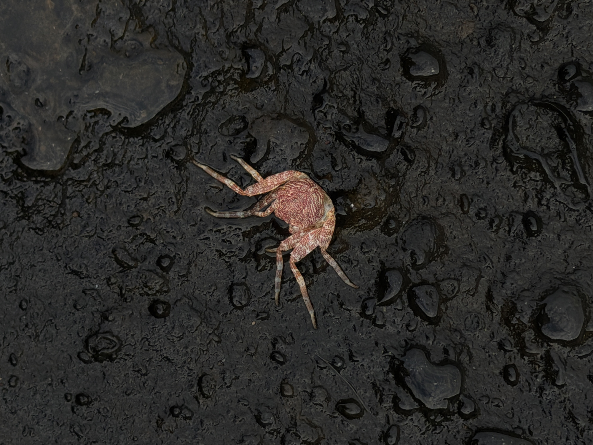 A single, immobile crab is positioned centrally on a dark, textured, and wet ground surface in Sudimara, Indonesia. The crab is inverted, displaying its ventral side, which features a coral-red coloration with irregular cream-colored patterning. Its eight ambulatory legs and two claws are splayed outwards. The surrounding ground is dark gray to black, uneven, and covered with numerous small water puddles and droplets, indicating a damp environment. Several dark, rounded stones or aggregate particles are visible across the wet surface. No other subjects are present, and no active movements or interactions are depicted.