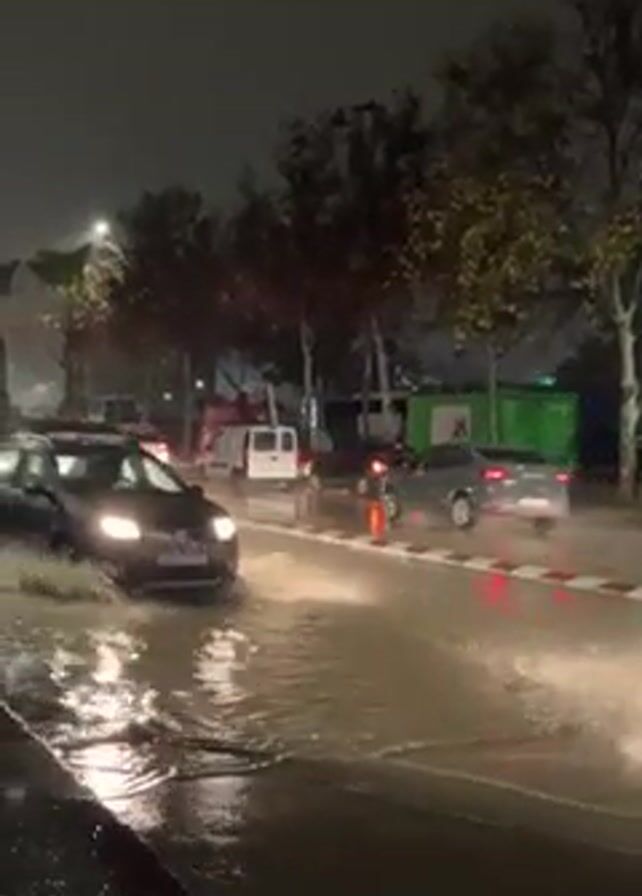 cars driving through a flooded city street at night. The road is covered in several inches of water, with water splashing as the vehicles pass. Trees line the street. There are other vehicles including cars and a truck visible in the background. Streetlights illuminate the scene.